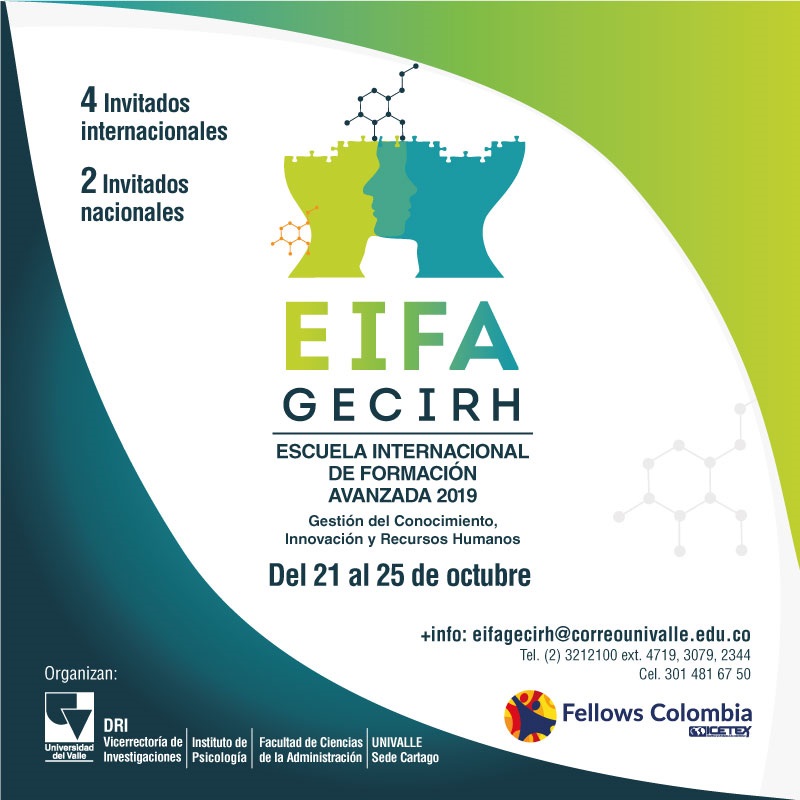 La EIFA GECIRH 2019 es un espacio que se propone y se desarrollará desde tres grupos de investigación del Instituto de Psicología y la Facultad de Ciencias de la Administración de la Universidad del Valle, a saber, 1) Grupo de Investigación Psicología Organizacional y del trabajo, 2) Grupo de Investigación Gestión y evaluación de Políticas, Programas y Proyectos (GYEPRO) y 3) Grupo de Humanismo y Gestión.