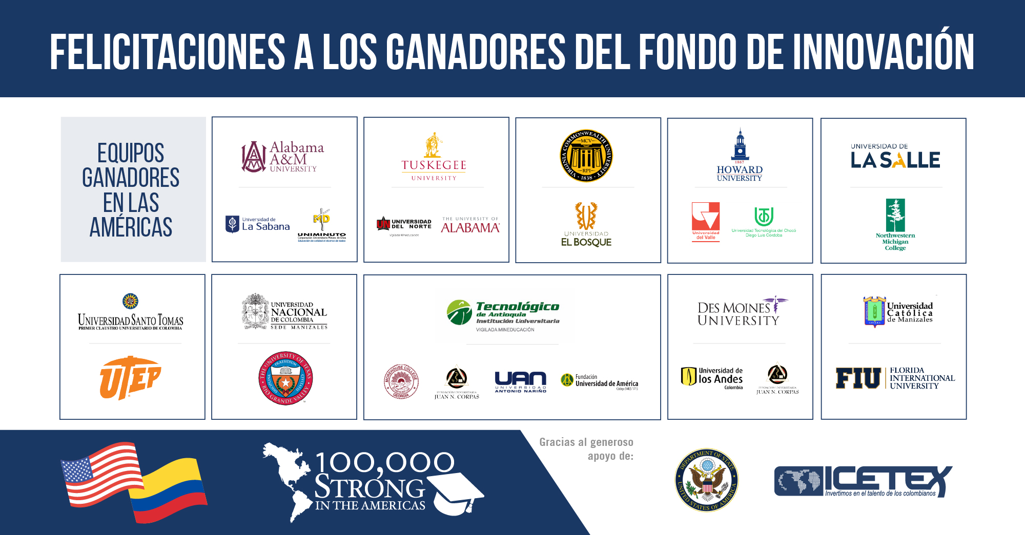 Este Fondo de Innovación 100K Strong in the Americas, patrocinado por el ICETEX (Instituto Colombiano de Crédito Educativo y Estudios Técnicos en el Exterior) y la Oficina de Asuntos del Hemisferio Occidental del Departamento de Estado de los Estados Unidos, invita a las instituciones de educación superior de los EE. UU. a asociarse con instituciones de educación superior de América Latina y el Caribe, para diseñar y llevar a cabo nuevos modelos innovadores de capacitación académica y programas de intercambio internacional, proporcionando una subvención de $26.175 USD a cada proyecto ganador.
