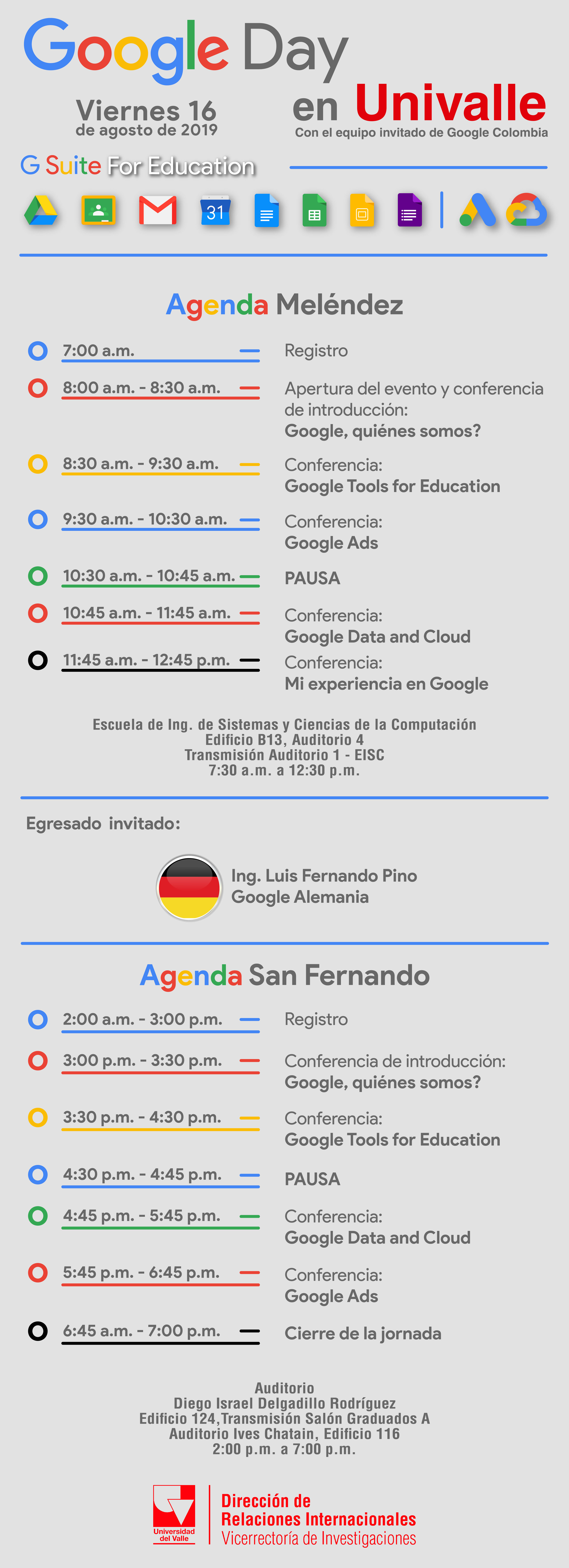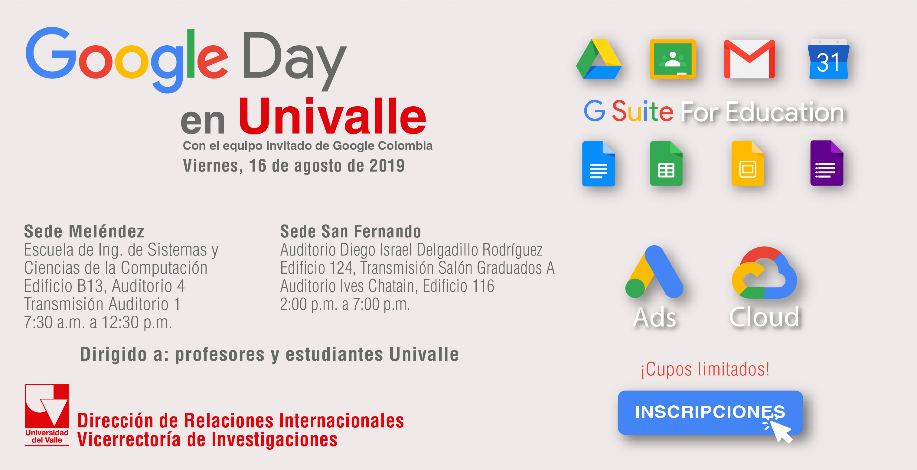 La Dirección de Relaciones Internacionales y la multinacional Google los invitamos a participar del Google Day, evento diseñado para que nuestra comunidad académica pueda interactuar y profundizar sobre usos académicos e investigativos de diversas aplicaciones de Google.